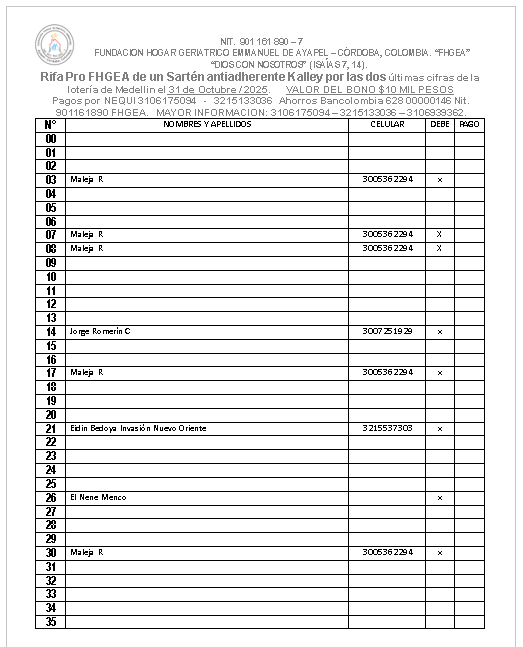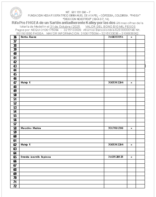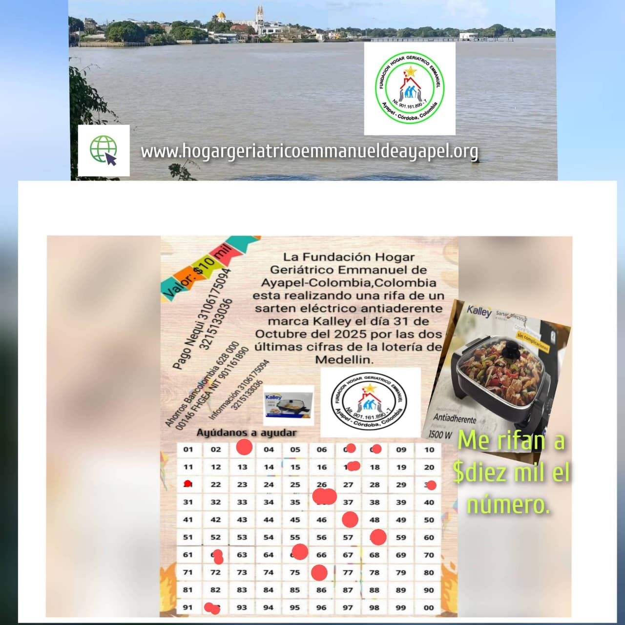 LA FUNDACION HOGAR GERIATRICO EMMANUEL DE AYAPEL SE PERMITE INFORMAR: QUE A PROGRAMADO UNA RIFA DE un sarten antiadherente Kalley el dia 31 de Octubre del 2025 por las dos ultima cifras de la loteria de Medellin. VALOR DEL BONO 10 MIL PESOS. BONO SIN CANCELAR NO JUEGA. Ayudanos a ayudar.