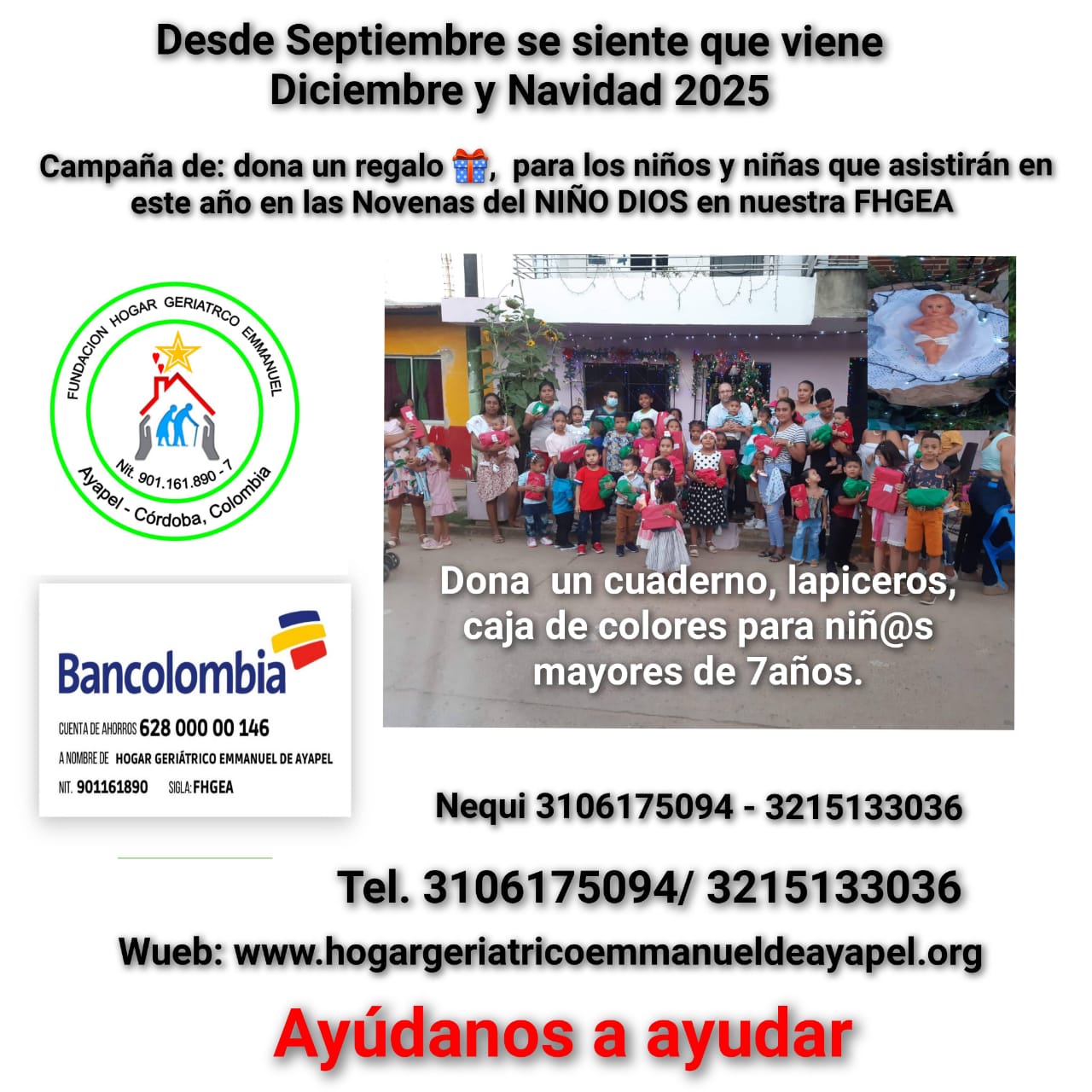 LA FUNDACION HOGAR GERIATRICO EMMANUEL DE AYAPEL INFORMA: QUE CONTINUAMOS HACIENDO ACTIVIDADES CON EL FIN DE CRECER MAS EL FONDO ECONOMICO CON EL FIN DE MEJORAR LA ATENCION A NUESTROS ADULTOS MAYORES EN EL PRESENTE AÑO 2025. DIAS DE ATENCION DE LUNES A VIERNES CON EL HORARIO DE 8:00 AM A 3:00 PM. MAYOR INFORMACION EN EL: 3106175094 – 3215133036 – 3106939362. ESTA MODALIDAD ES EXTERNA PARA Adultos mayores de 65 años en adelante.